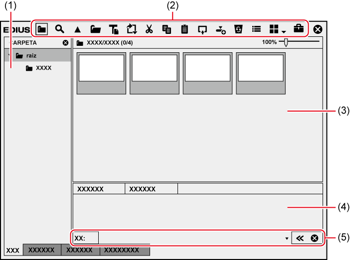 Esta zona permite estructurar las carpetas y organizar los clips. Las carpetas pueden crearse y estructurarse a partir de la carpeta [raíz] y toda la carpeta en la que se almacenan las fuentes en un PC puede asociarse al contenedor. |