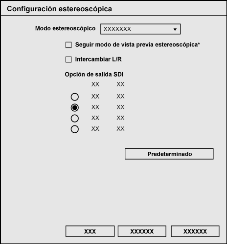 Para exportar por separado el vídeo del lado L (para el ojo izquierdo) y del lado R (para el ojo derecho) en el proyecto creado en el modo edición estereoscópica, seleccione [Sí]. Para exportar el vídeo del lado L y del lado R como un archivo único, seleccione [No]. Haga clic en [Opciones] en el lado derecho de [Flujo], y seleccione un formato de procesamiento estereoscópico en el cuadro de diálogo [Opciones - Configuraóion estereoscópica]. Cuadro de diálogo [Opciones - Configuraóion estereoscópica] (Generic OHCI) |