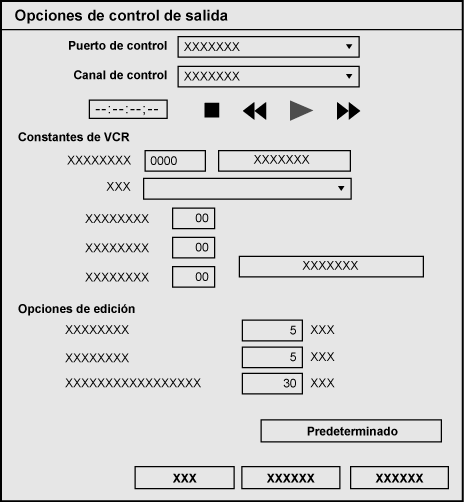 [VCR ID(V)] Muestra los bytes 1 y 2 de la constante 1 de VCR. Muestra el ID de pletina (incluyendo el modelo y el modo) para pletinas SONY. [Comprobar ID de aparato] Haga clic en esta opción para cargar el ID de VCR (ID de pletina) desde el VCR conectado. [VCR] Muestra el nombre de pletina correspondiente al ID de VCR (solo el ID y el nombre de VCR predefinidos). Muestra si hay varias pletinas con el mismo ID registradas. [Editar retraso] Muestra el byte 6 de la constante 1 de VCR. Si la pletina no forma parte de la opción predefinida, debe introducirla manualmente. [Retraso de E-E] Muestra el byte 5 de la constante 1 de VCR. Si la pletina no forma parte de la opción predefinida, debe introducirla manualmente. [Iniciar retraso] Muestra el byte 2 de la constante 2 de VCR (datos 10 en función de la pletina). Si la pletina no forma parte de la opción predefinida, debe introducirla manualmente. [Cargar opciones predefinidas predeterminadas] Inicializa el retardo de edición, el retardo E-E y el retardo de inicio con los valores predefinidos. |