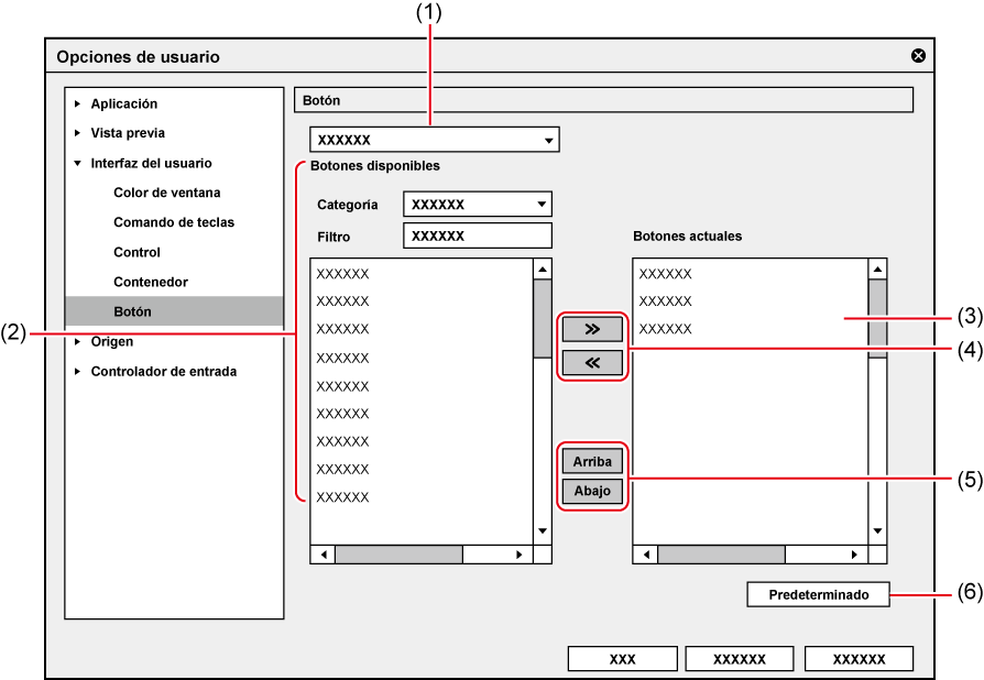 [Categoría] Seleccione una categoría para desplegar [Botones disponibles]. [Filtro] Introduzca una palabra clave para desplegar [Botones disponibles]. |