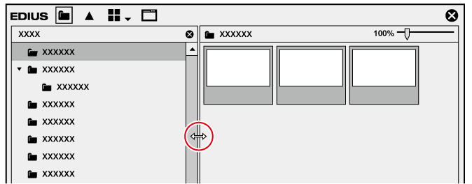 1) Arrastre el borde entre la vista de carpeta y la vista de clip de la ventana de explorador de origen, o el borde entre la vista de clip y la vista de metadatos.