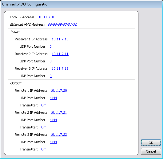 IP Input/Output configuration for channels provided via K2 Summit IP codec boards is performed via the Channel IP I/O Configuration menu.